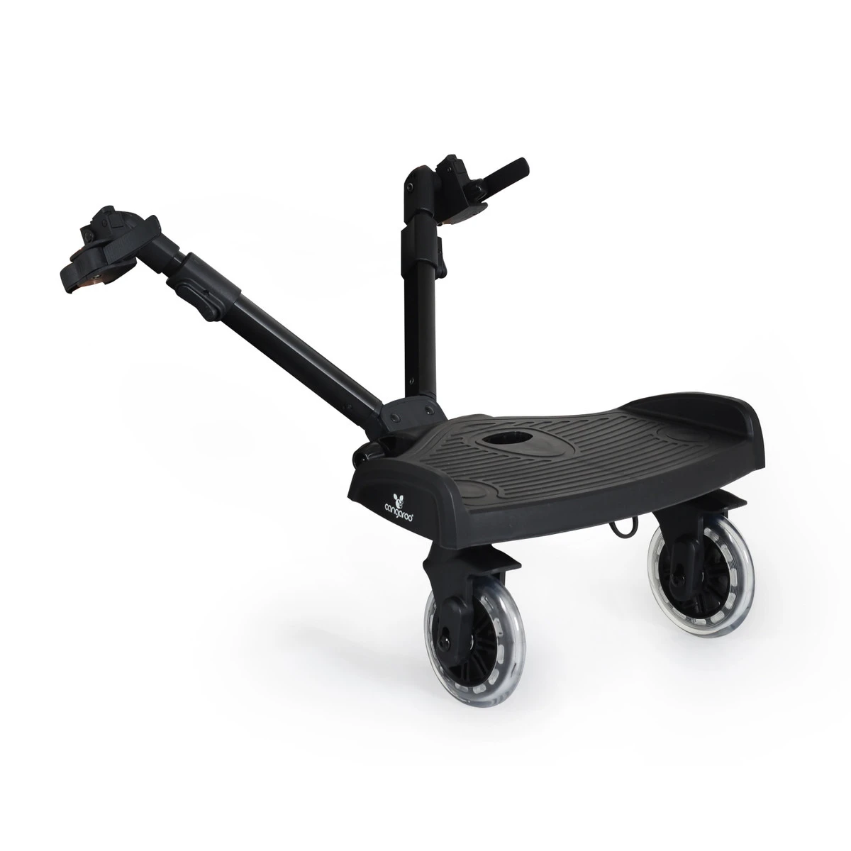 Het meerijdplankje is 58 x 36 x 56 cm groot en kan compact ingeklapt worden tot 60 x 17 x 32 cm. Hij is geschikt voor kindjes vanaf 15 maanden tot een maximumgewicht van 20kg. Wanneer je het plankje even niet gebruikt kun je hem makkelijk omhoog klappen, zo hoef je hem niet helemaal te demonteren.