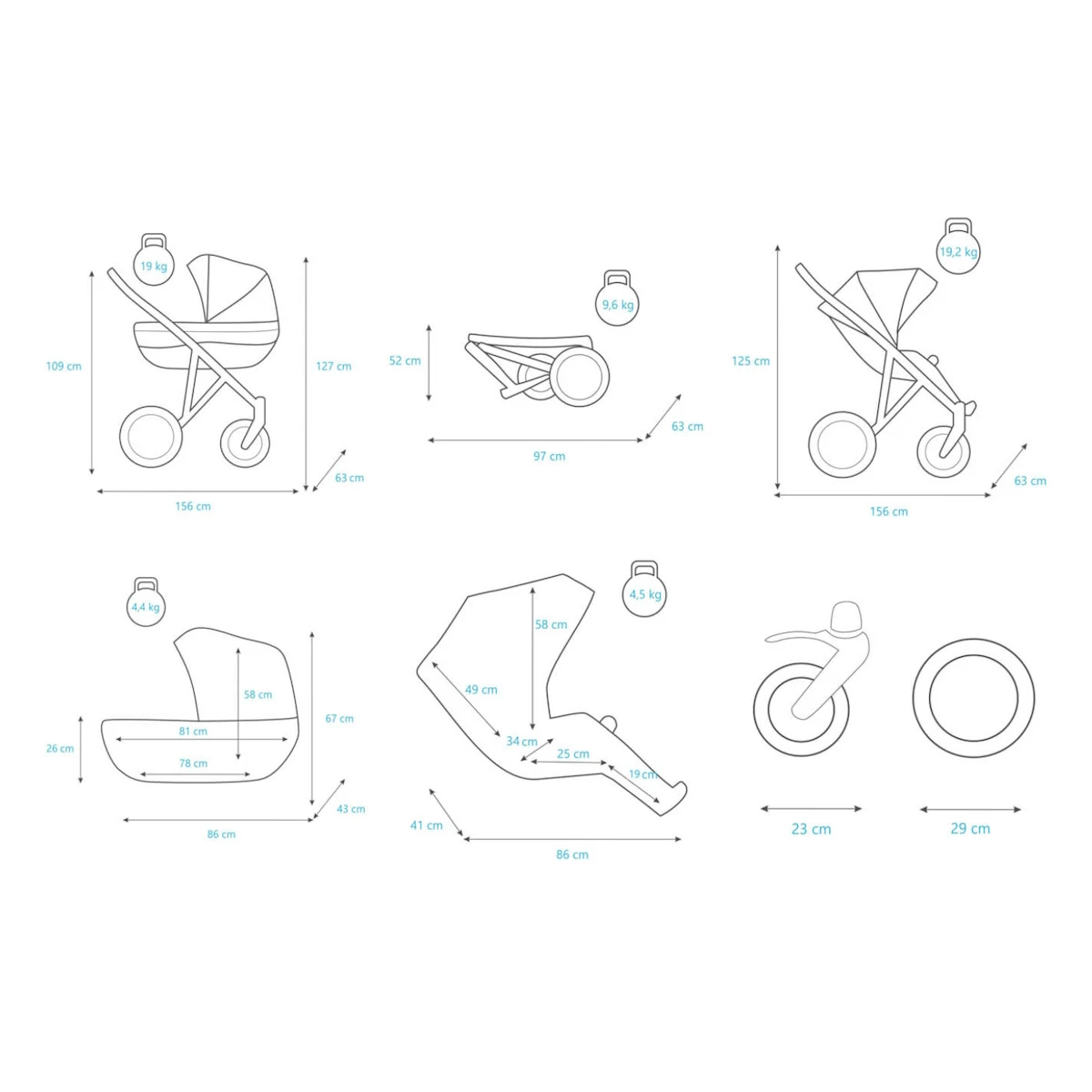 - Diameter voorwielen: 23 cm